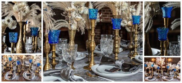 B20-7 Vibrant Blue Votives and Aged Brass Candlesticks