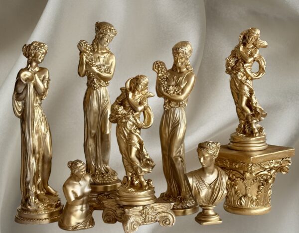 Step into a Gilded Age or Regency Era Bridgerton-Style bash with major vintage glam—Golden Roman Columns, Aphrodite Statues and Grecian Urns & Busts Use these Statues, Busts, and Floral Vessels on your event tables, bar areas, dessert presentation areas, or perched on our Roman Columns to greet your arriving guests.—Totally Ton-Approved.