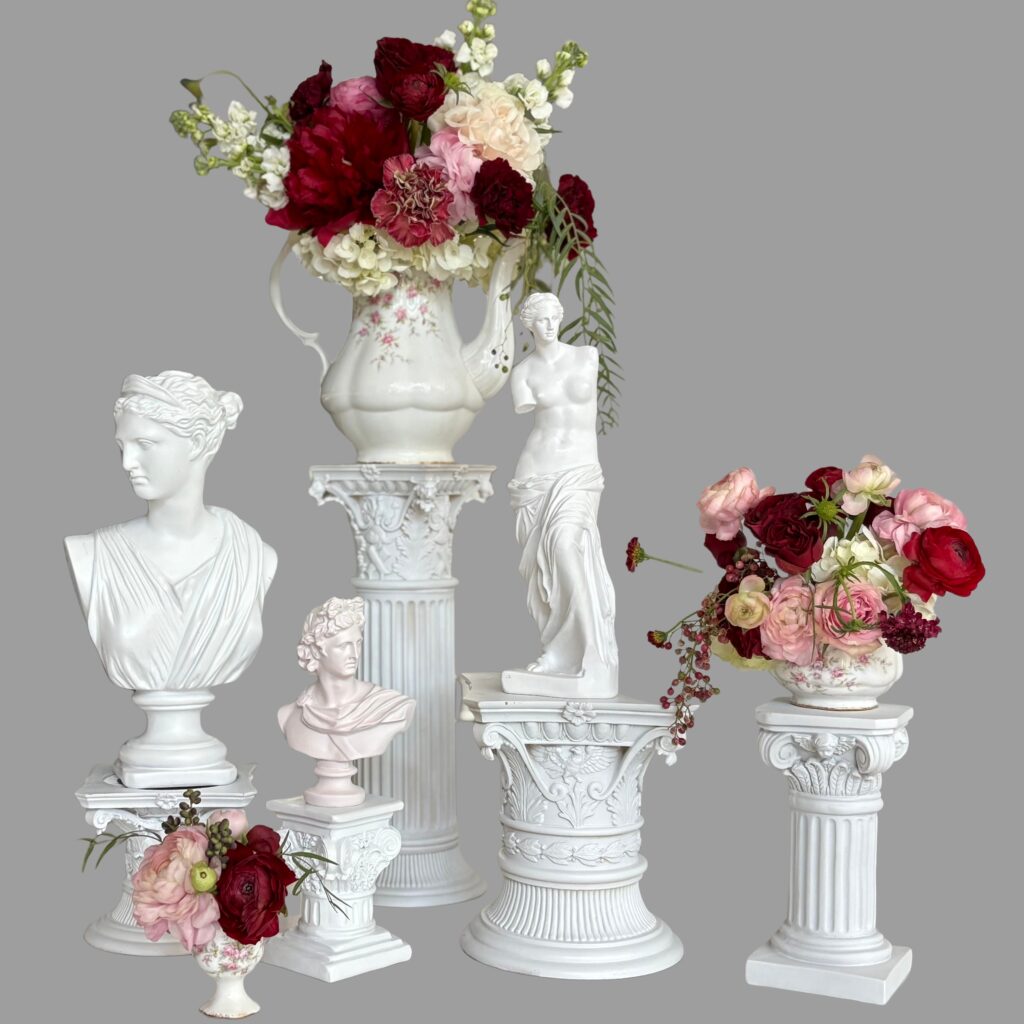 Step into a Bridgerton-Style bash with major vintage glam—Golden Roman Columns with Grecian busts displayed and all the drama. Think classical meets cool, with luxe vibes, soft lighting, and romantic candlelight setting the scene. It’s old-school elegance with a modern edge—Totally Ton-Approved. Add our collection of assorted sizes of Grecian Statues and tabletop columns as statement pieces to your event tables, and other areas.