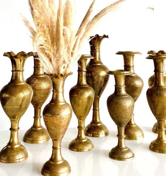 Perfectly suited for corporate events, galas, weddings, conferences, and brand activations, these floor-height vessels function as architectural décor elements. Place them at event entrances, along aisles, stages, lobbies, or reception focal points to create scale, rhythm, and atmosphere. For a cohesive and elevated presentation, our etched brass floor vases pair beautifully with our floor-height brass candlesticks and tabletop vintage brass vases.