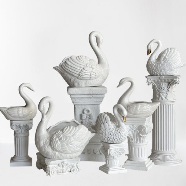 Our Swan Lake Swancore Garden Collection features graceful sculptural swan accents and swan floral compotes that create elegant focal points for your event tables. With their sweeping necks and classic form, the swans bring a romantic, sculptural element to centerpieces and our assorted collection can hold small to large floral arrangements. Swans evoke a sense of enduring romance and elegant reminder of partnership, unity, and timeless connection.