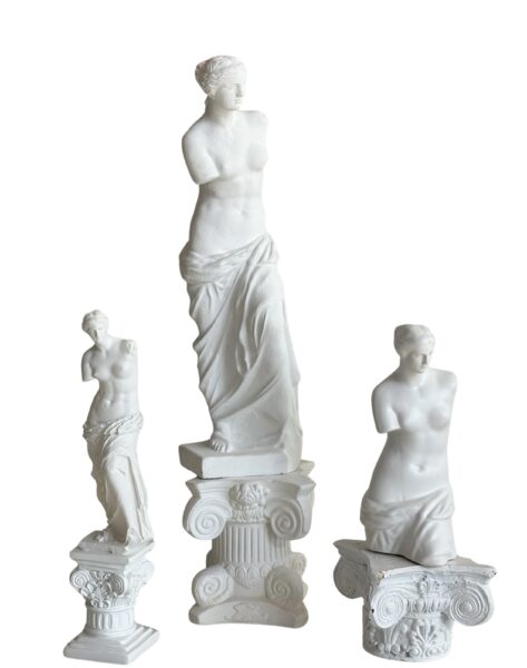 Our Venus Statuary Collection bring a sense of whimsey to any tablescape. Inspired by the Roman goddess of love, these sculptural accents evoke the charm of European gardens and historic estates. They can be styled in a bed or lush mound of florals as a centerpiece, or used as sculptural accents to add visual interest to a tablescape. Perched upon our floor height roman columns they make a statement at your event. Perfect for galas, weddings, garden parties, and showers. Venus creates a dreamy, old-world garden aesthetic.