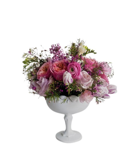 Vintage milk glass pedestal compotes and vessels bring a soft, luminous presence to the table, each one uniquely shaped with its own delicate detailing—from scalloped rims to fluted stems. Their creamy white finish reflects light beautifully, making florals feel fuller, brighter, and more layered without overwhelming the design. Because no two are exactly alike, they create a collected, curated look that adds depth and visual interest across the table, elevating even the simplest arrangements into something that feels intentional, elevated, and quietly striking.