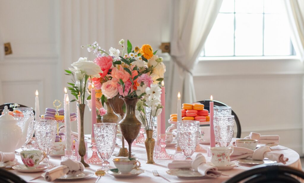 Bridgerton Themed Tablescapes using Dixie Does Vintage China and Dixie Does Vintage designed floral centerpieces.
